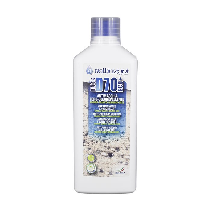 Idro e oleo repellente impiegato per la protezione delle superfici orizzontali e verticali in marmo, granito, cotto, pietre naturali, ceramica e gres. Prodotto in grado di prevenire la penetrazione dell’acqua, dell’olio, grassi alimentari e dell’umidità. La sua formulazione lascia respirare il materiale permettendo l’uscita dell’umidità residua ma impedendone l’assorbimento da parte della pietra. BLOCK D70 ECO PLUS ostacola la formazione della muffa.